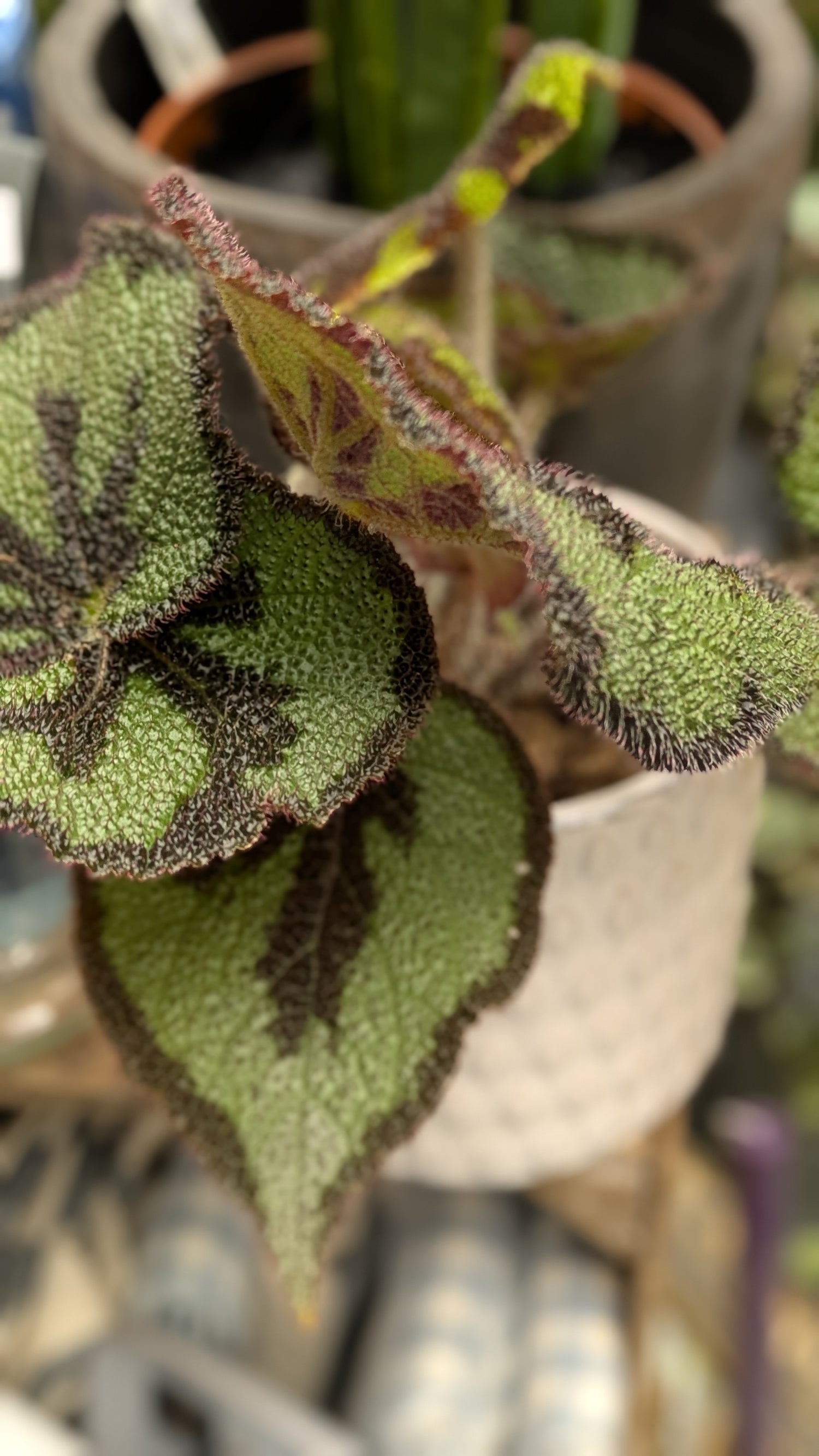 Plant maintenance: This plant requires bright, indirect light and should be kept out of direct sunlight. It also prefers a humid environment, so misting the leaves regularly can help it thrive. Begonias will not tolerate continuous direct sunlight or water logging.