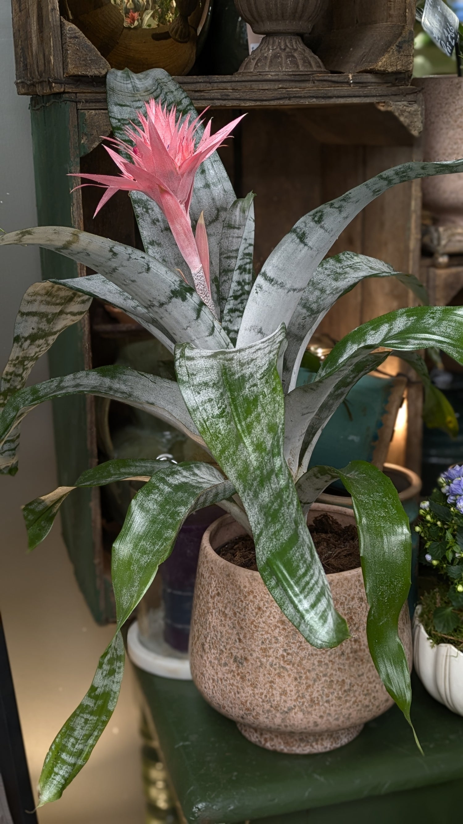 Indulge in the exotic beauty of this Primera plant. This luxurious native of the Brazilian rainforests, boasts broad green leaves adorned with silver-grey markings. Its show-stopping flower spike bursts with pink bracts and small purple flowers. Elevate any space with this intriguing houseplant.